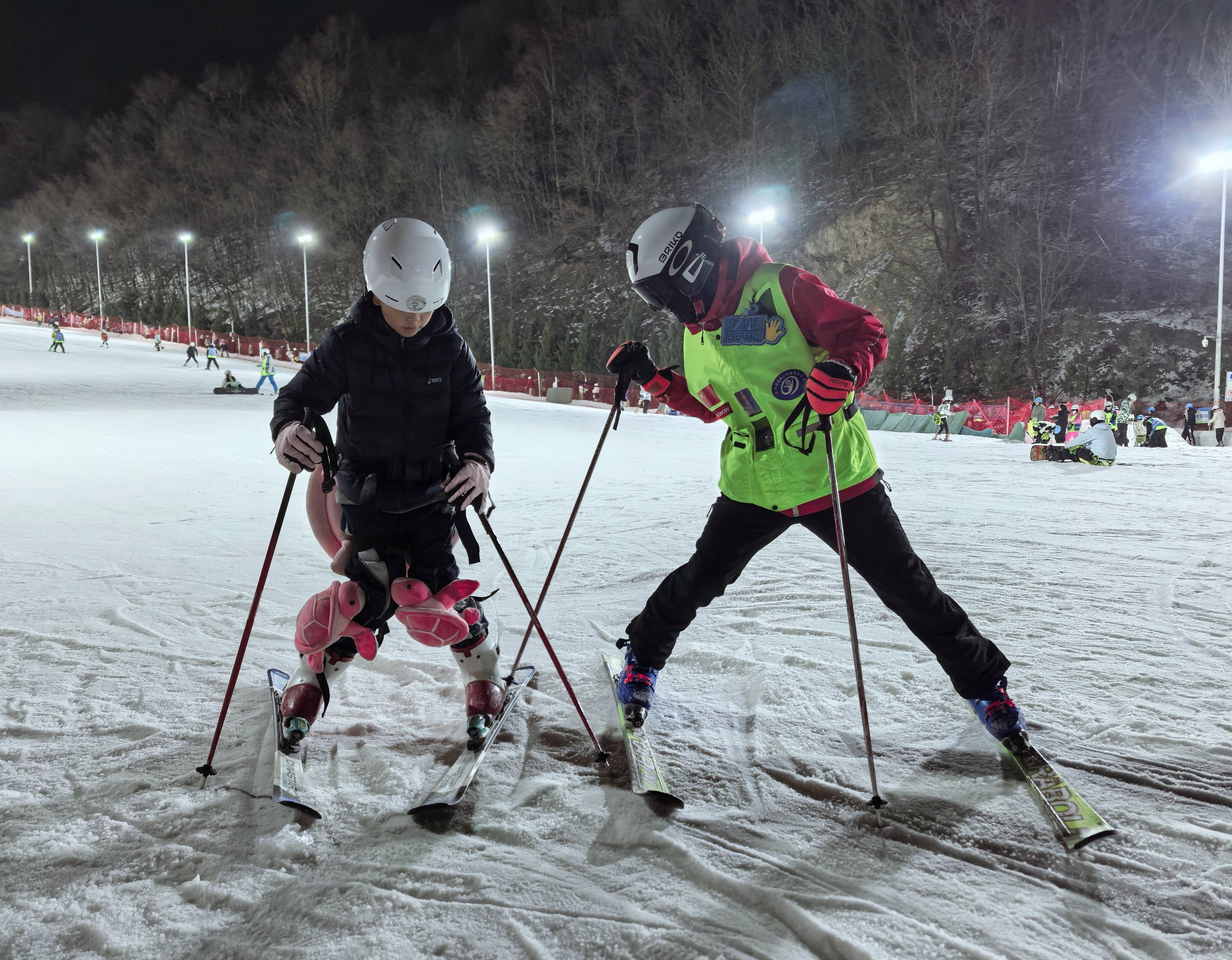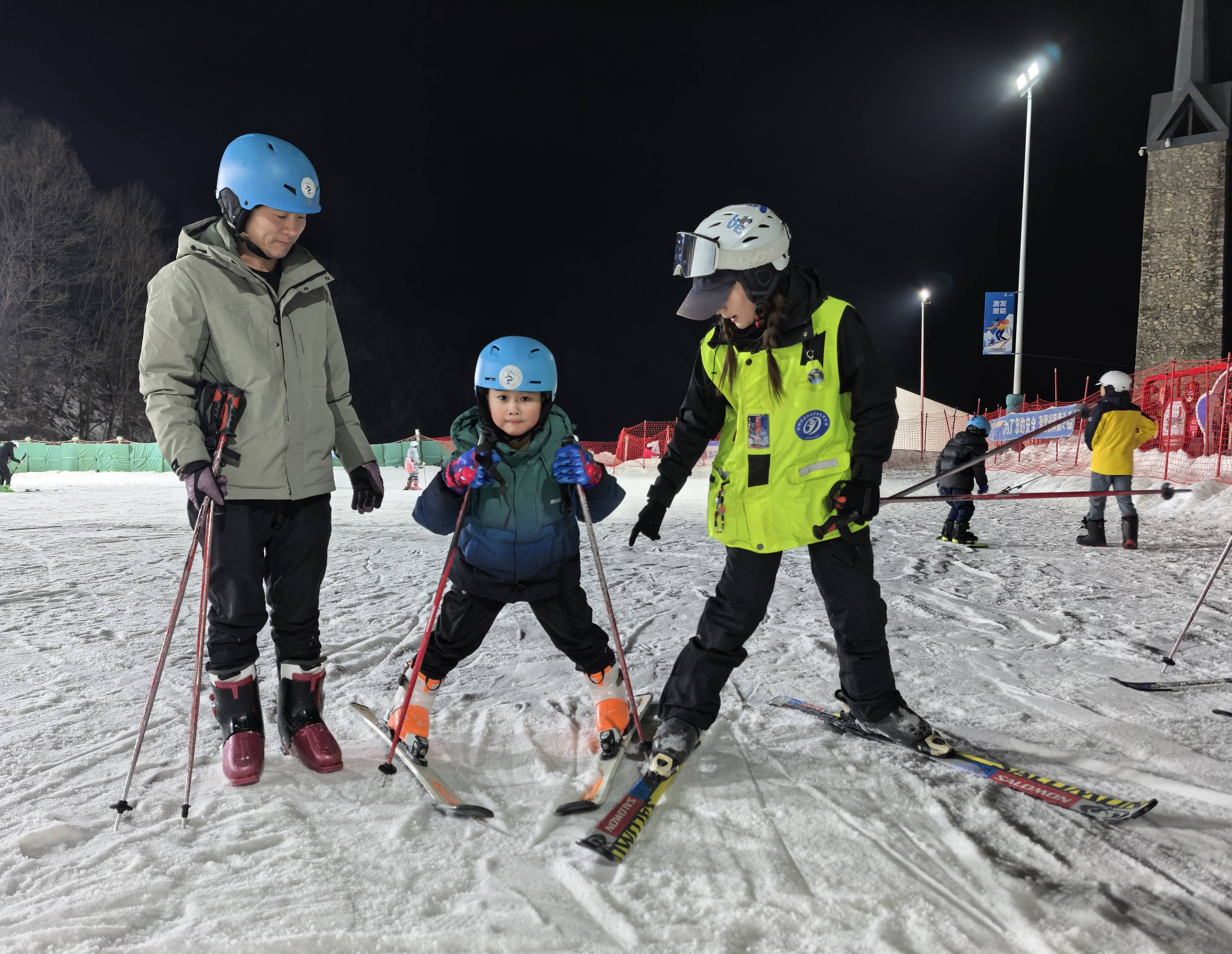 刘文健(右)正耐心指导一名孩子滑雪。新华社记者 贺占军 摄“很喜欢夜场,月光、灯光与冰雪交融,意境特别好。”刘文健说,现在滑夜场的人越来越多,很多人都是“全家总动员”来滑雪。